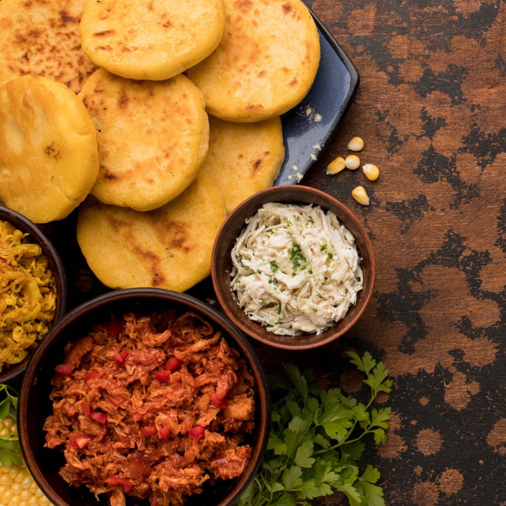 Beverages: Fresh Papaya or Passionfruit Juice, Venezuelan-style Coffee (Guayoyo or Marrón), Chicha (sweet rice drink, optional for dessert)